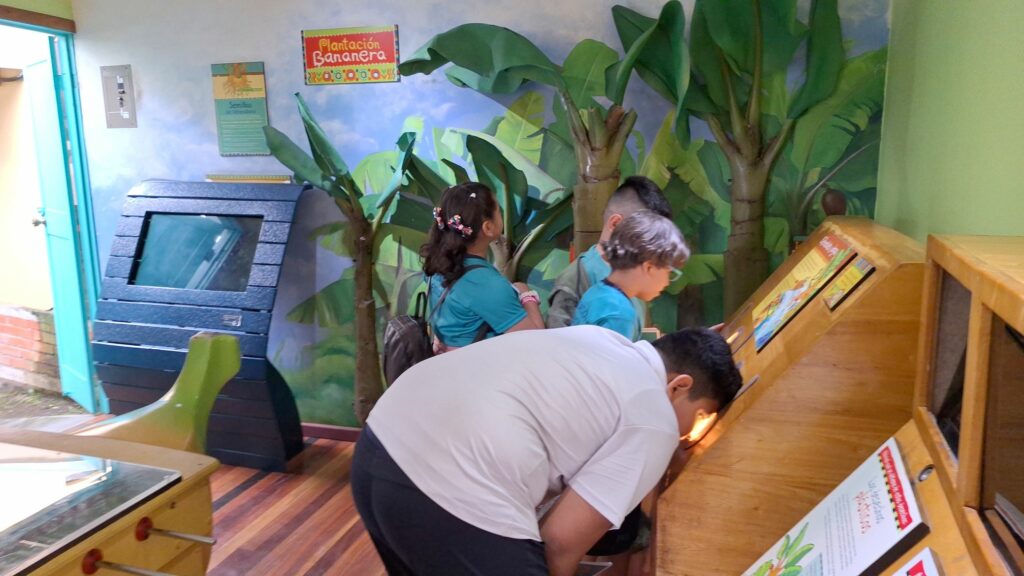 Cerca de ahí, se encuentra la Sala el Banano, donde el anfitrión “Nanito” recibe con entusiasmo a los niños para invitarlos a conocer sobre la producción del banano, los cuidados de la plantación y todos los procesos que conlleva la exportación de esta fruta.
