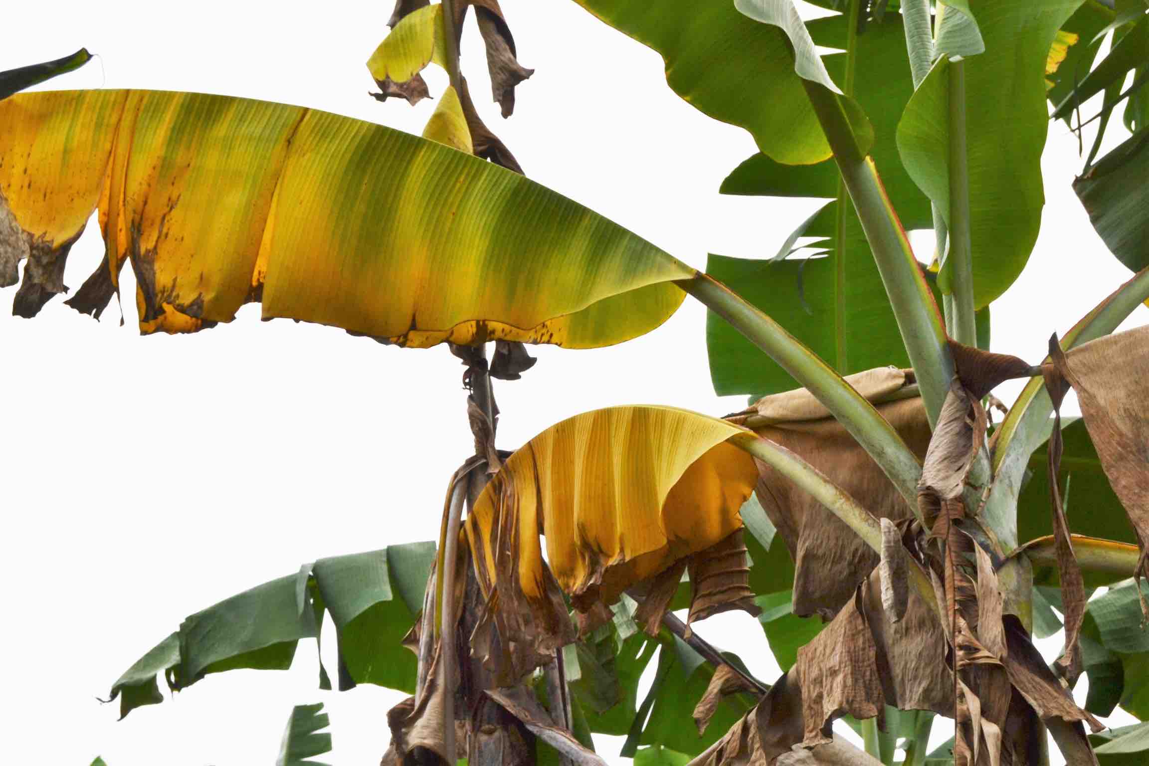 Conforme la enfermedad incrementa su severidad, las hojas se doblan producto del colapso de los pseudopeciolos formando una falda alrededor de la planta; posteriormente, la planta se marchita por completo y muere.