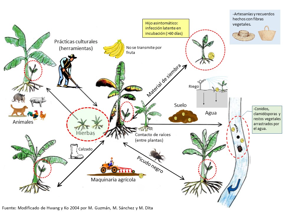 Es históricamente la enfermedad más destructiva de las musáceas y está considerada entre las diez enfermedades más importantes en la historia de la agricultura. Es causada por el hongo Fusarium oxysporum f. sp. cubense (Foc). El patógeno habita en el suelo e inicia la infección por las raíces, luego alcanza el sistema vascular para invadir todos los órganos de la planta con excepción del fruto. Durante la invasión del patógeno se produce un bloqueo del sistema vascular, afectándose la absorción y translocación de agua y nutrimentos. Como resultado, las plantas se marchitan y finalmente mueren.