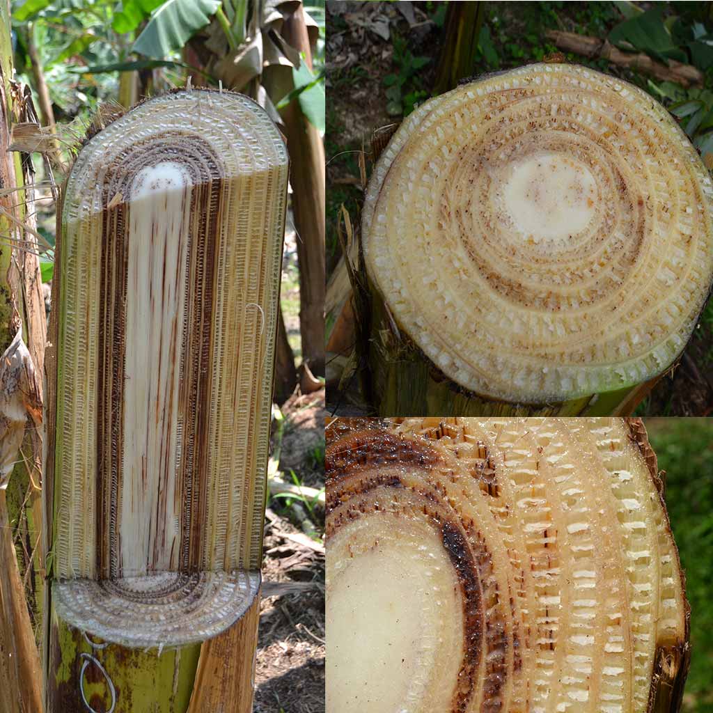 Internamente, los tejidos de la planta se decoloran y se observan haces vasculares obstruidos en cormo, pseudotallo, pseudopeciolo y vena central de la hoja. Solamente los frutos no manifiestan síntomas, excepto que estos no se desarrollan normalmente debido al colapso de la planta.